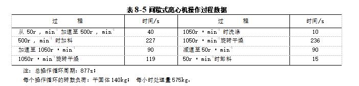 间歇卸料式离心机使机器加速至适于进料的转速所需的时间,加入物料所需时间,加速到脱水所需转速,并保持该转速所需的时间,洗涤所需时间,旋转干燥时间.