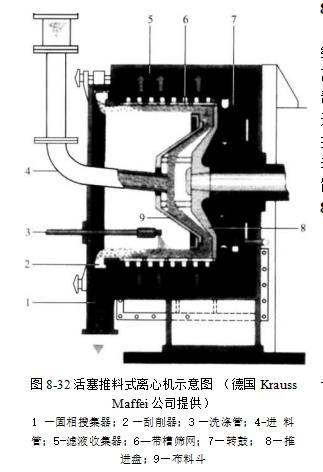 连续卸料式离心机在这些装置中,料浆直接加向旋转转鼓的后部,转鼓还包括一个旋转的往复运动的推进盘.