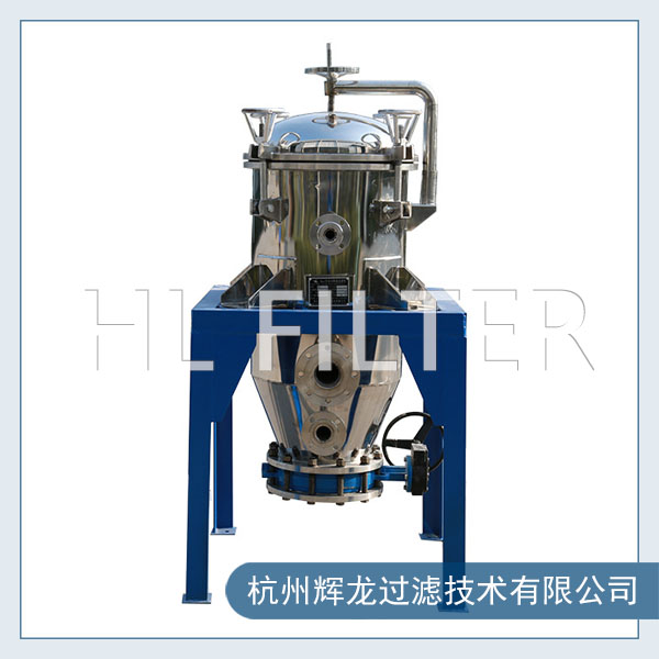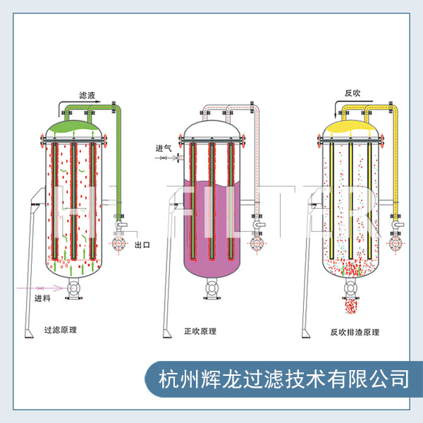 过滤机无需滤饼过滤,对细粘的料液,使得过滤速度一直处于很高的起始通量状态在过滤过程中,一组过滤,一组反吹模式中,过滤机内反吹下来的液渣快速进入过滤机的圆锥底部,并在底部排出.