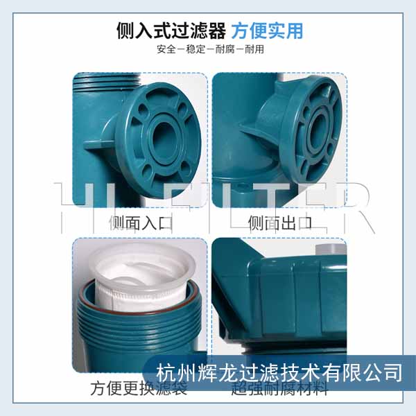 1、产品为全新塑胶过滤器,侧进侧出法兰式出入口一体成型、经济耐用。